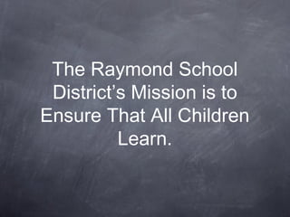 The annual performance report summarizes the Raymond School District's performance in the 2008-2009 school year. It provides details on staffing, facilities, enrollment, programs, and test scores at both the elementary and junior/senior high levels. It also outlines the district's continued focus on improving student achievement in reading, writing, and math through its school improvement plans.