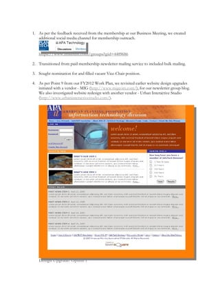 The Technology Division of the American Planning Association aims to promote the use of technology in planning and community development. In FY2012, the division achieved major accomplishments, including increased member engagement through social media, publication of newsletters, and successful conference participation, while facing challenges in membership retention and social media conversion rates. The FY2013 work plan focuses on maintaining membership, developing a mobile website, and collaborating with various stakeholders for technology-related initiatives.