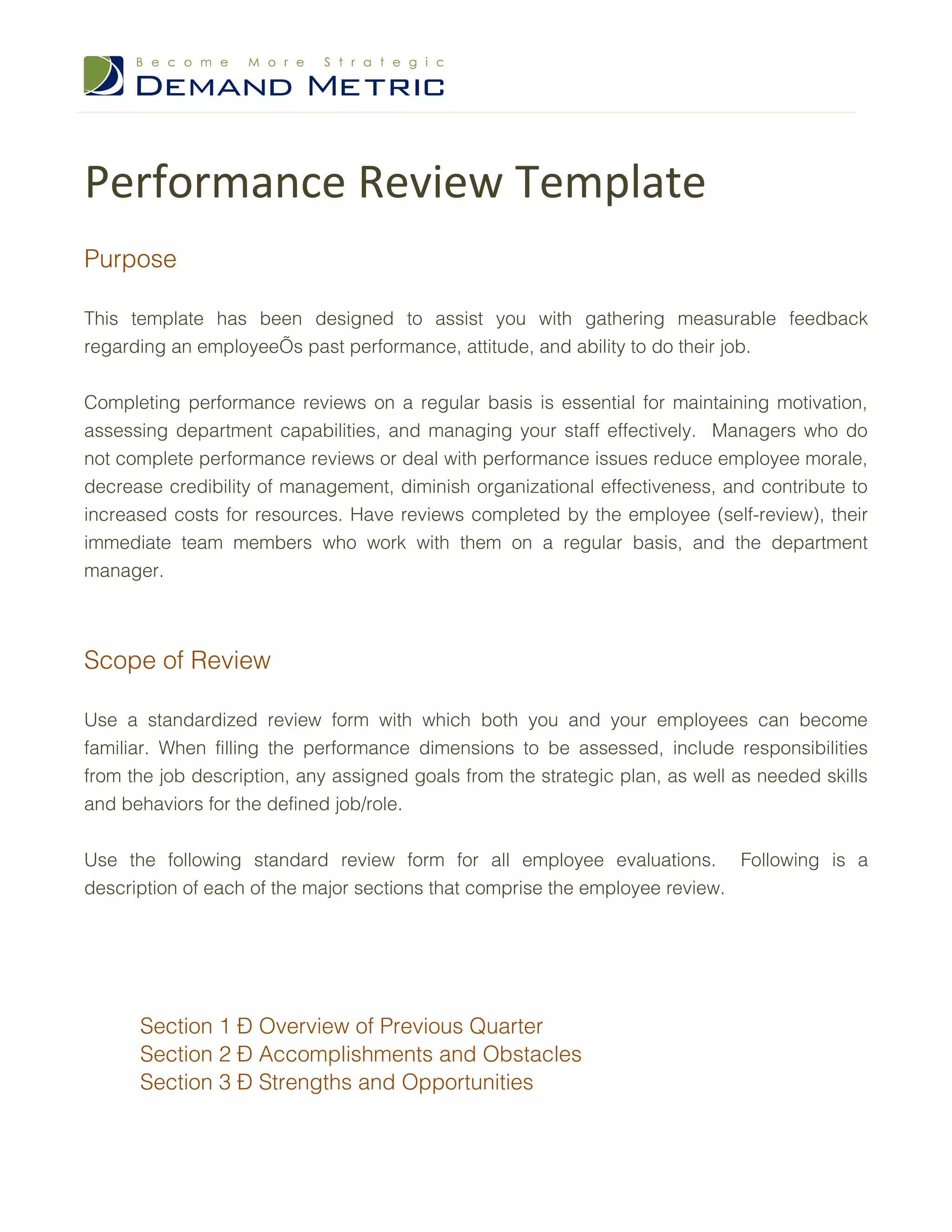 This document provides a performance review template to gather feedback on an employee's performance, attitude, and job abilities. It includes sections for reviewing accomplishments, strengths, opportunities, goals, suggestions for improvement, self-evaluation of competencies, and manager evaluation of competencies. Completing regular performance reviews is important for motivation, assessing capabilities, and effective management. The template standardizes the review process and includes areas relevant to job responsibilities and organizational goals.