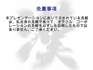免責事項 本プレゼンテーションにおいて示されている見解は、私自身の見解であって、オラクル・コーポレーションの見解を必ずしも反映したものではありません。ご了承ください。