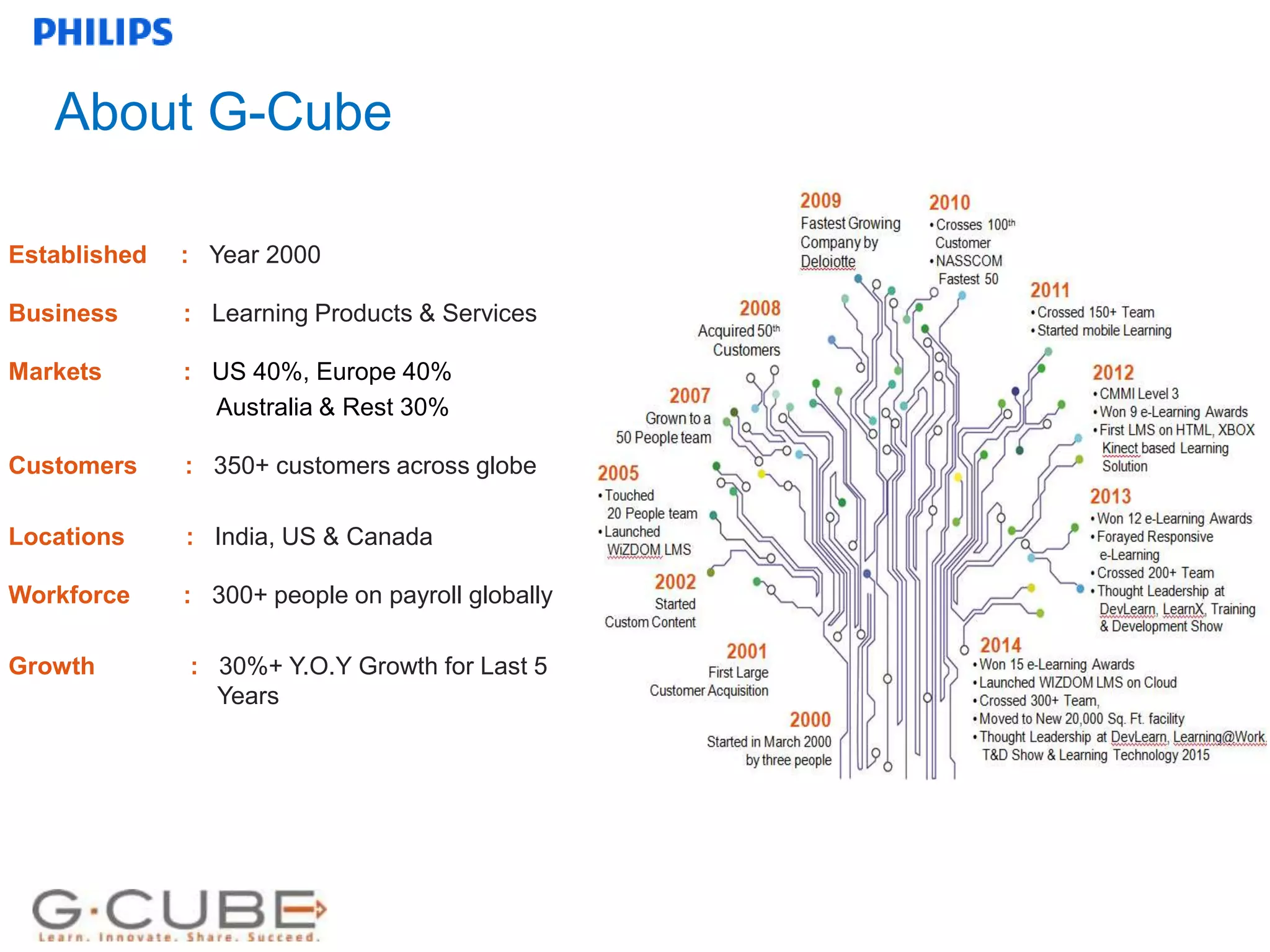 The document outlines a webinar by Anusha Jain and Hans Ramaker focusing on performance support solutions to address knowledge gaps. G-Cube, a leading learning solutions provider, reports significant growth and recognition in the industry while emphasizing the importance of integrating performance support into training strategies. Key topics include effective learning methods and the challenges faced in implementing performance support within organizations like Philips.