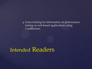 This document provides an overview of performance testing concepts and LoadRunner software. It discusses the need for performance testing, different types of performance testing, and introduces LoadRunner components and functionality. The document then walks through the process of creating a LoadRunner script using VuGen, including recording a script, customizing runtime settings, and viewing test results. Key LoadRunner concepts like correlation, parameterization, and functions are also explained briefly.