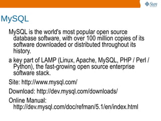 This document provides an overview of performance tuning the MySQL server. It discusses where to find server configuration and status information, how to analyze what the database is doing using status variables, and which configuration variables can be tuned for optimization, including global, per-session, and storage engine variables. Key areas covered include memory usage, query analysis, indexing strategies, and tuning storage engines like InnoDB and MyISAM.