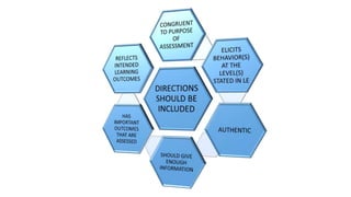 This document discusses performance-based assessment. It defines performance-based assessment as a direct and systematic observation of student performance based on predetermined criteria. This is presented as an alternative form of assessment to traditional paper-and-pencil tests. The document outlines key features of performance-based assessment, including greater realism and complexity of tasks, as well as greater time needed for assessment and use of judgment in scoring. It also discusses different types of performance-based assessment, developing rubrics to evaluate student performance, and the advantages and limitations of this assessment approach.