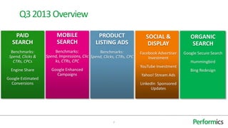 This document summarizes key performance metrics and industry developments in paid search marketing in Q3 2013. It found that paid search spend, clicks, and click-through rates all increased year-over-year in Q3 according to Performics' aggregate US client base. Mobile search spend and clicks both significantly increased. Product listing ad spend and clicks also grew. It also reviewed trends in social/display advertising, and algorithm updates from Google and Bing.