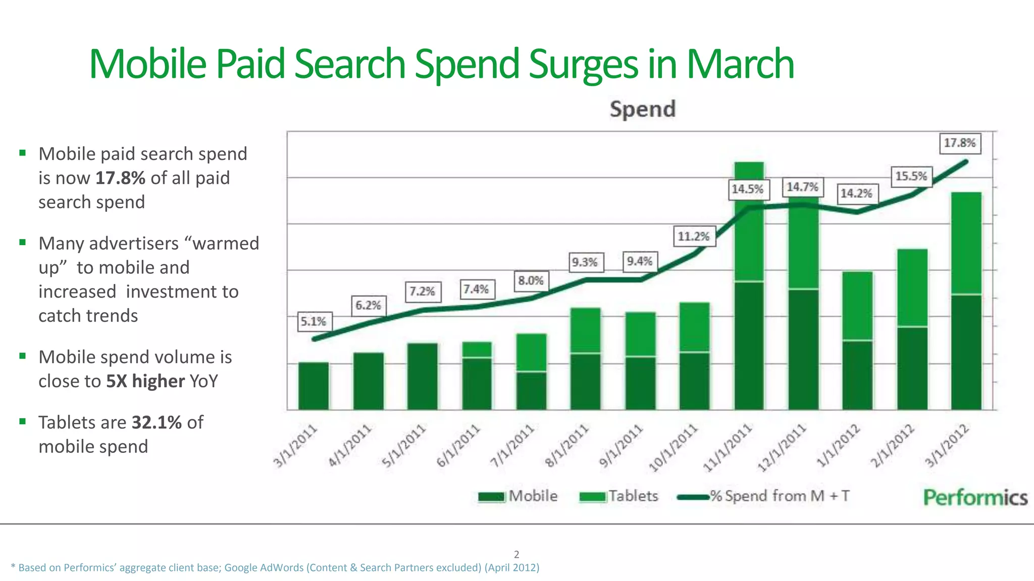In Q1 2012, mobile paid search spend surged to 17.8% of all paid search expenditures, with mobile click share also reaching an all-time high of 24.6%. The growth is fueled by increased investment in mobile advertising and the distinction between smartphone and tablet users, leading to different strategies for each device. Despite mobile growth, desktop search volume continues to rise, indicating that users are integrating both mobile and desktop searches into their routines.