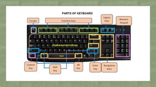 The document provides an overview of computers, detailing their hardware components, operating systems, and peripheral devices. It defines the functions of various computer parts such as input, output, and input/output devices while explaining the roles of the CPU and operating system. Additionally, it includes activities for identifying computer components and their functions.