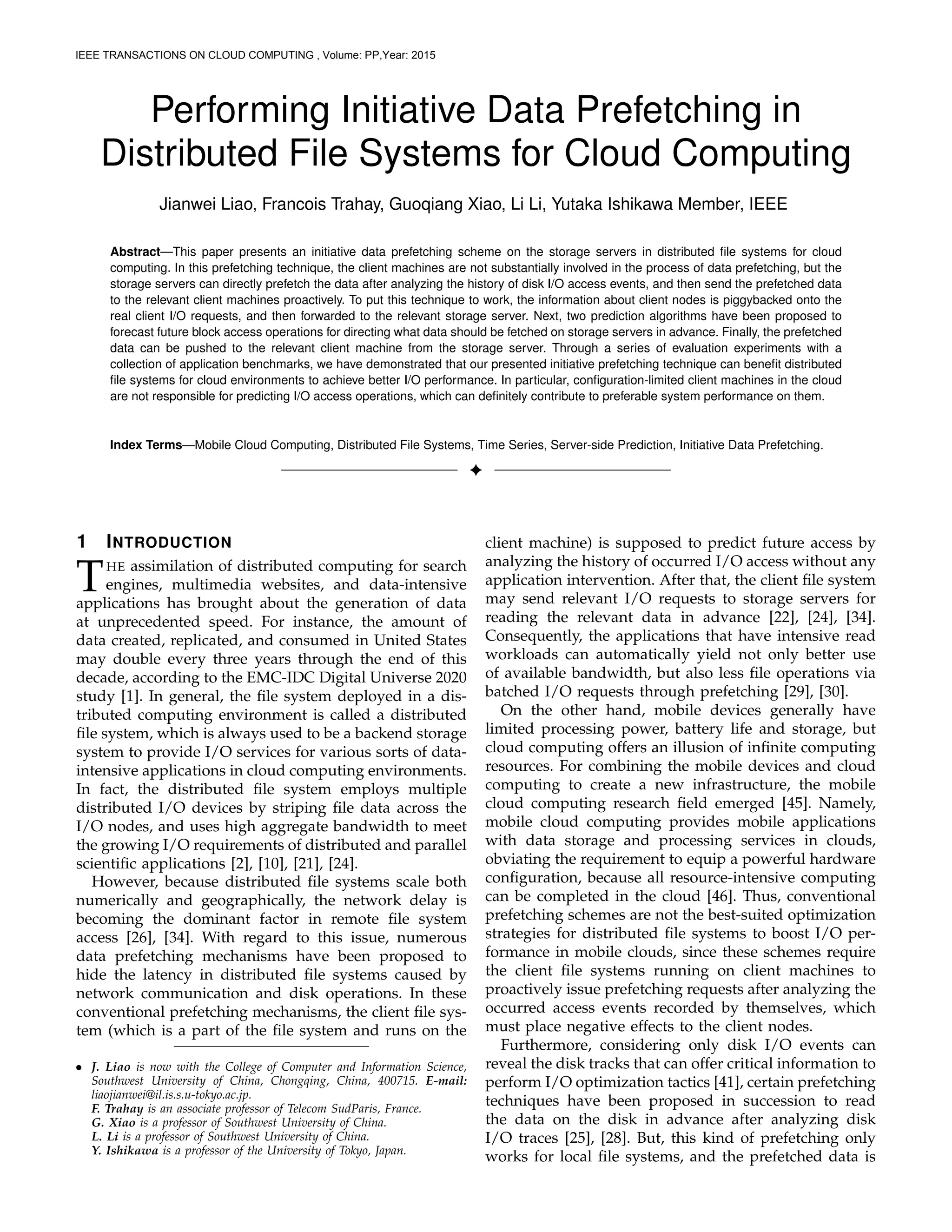 This paper proposes an initiative data prefetching scheme for distributed file systems in cloud computing, which allows storage servers to predict and prefetch data based on historical I/O access events without involving client machines significantly. Two prediction algorithms, chaotic time series and linear regression, are introduced to enhance I/O performance by pushing prefetched data to relevant clients, thus alleviating the burden on resource-limited machines. Evaluation experiments demonstrate that this technique effectively improves I/O performance in cloud environments.