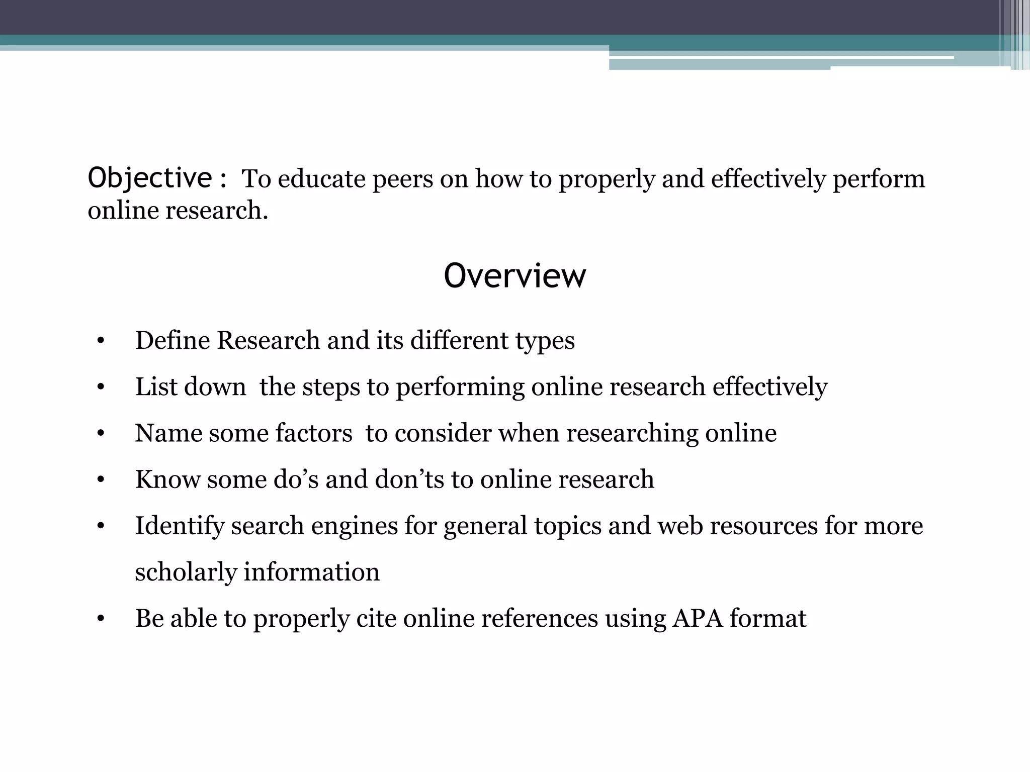 The document provides guidance on how to properly perform online research. It defines research and its types, lists the steps to effective online research, and names factors to consider such as source credibility and date. The document outlines dos and don'ts, recommends search engines and scholarly resources, and describes how to cite sources using APA format both in-text and in the references list. It concludes by emphasizing making a research plan and only using credible, up-to-date sources while avoiding plagiarism.