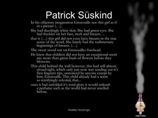 The document examines synaesthetic metaphors and analogies in Patrick Süskind's work, particularly the olfactory experiences of the protagonist, Grenouille. It discusses how Grenouille perceives a girl's scent in a deeply sensory manner, indicating a profound connection between smell and the essence of beauty. Additionally, it references various scholarly works that explore the relationship between literature, film, and sensory perception.