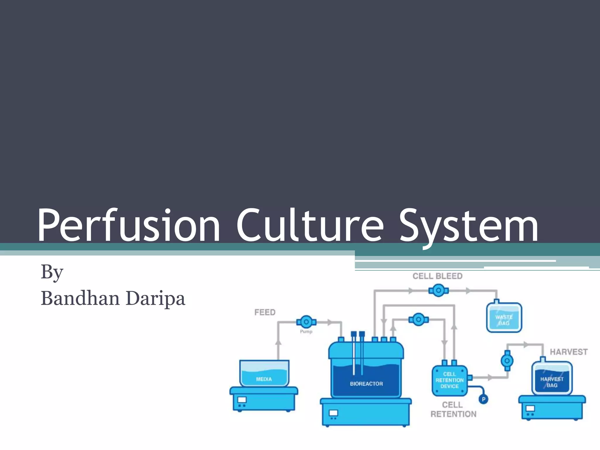 This document discusses perfusion culture systems. It begins by defining perfusion culture as a system where waste medium is continuously removed from the culture and replaced with fresh medium while retaining viable cells. It then discusses advantages of perfusion culture like high cell density, productivity and flexibility. It also covers cell retention methods in perfusion bioreactors like alternating tangential flow filtration and centrifugation. The document concludes by noting that perfusion culture can offer benefits like improved efficiency but requires consideration of validation and regulatory issues.