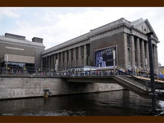 The Pergamon Museum in Berlin houses reconstructed monumental buildings from antiquity, including the Pergamon Altar and Market Gate of Miletus. It was constructed from 1910 to 1930 and contains parts transported from Turkey, though some argue the artifacts should be returned. The museum was damaged in World War II but many objects were stored safely. Some remain in Russia today despite agreements for their return.