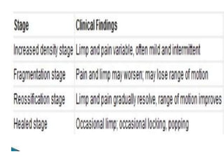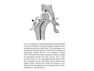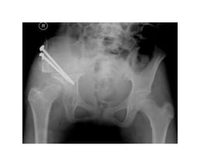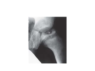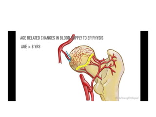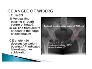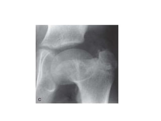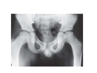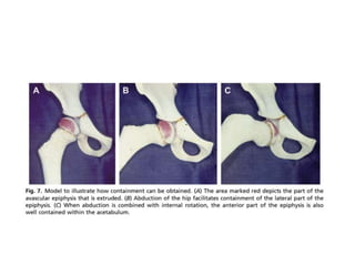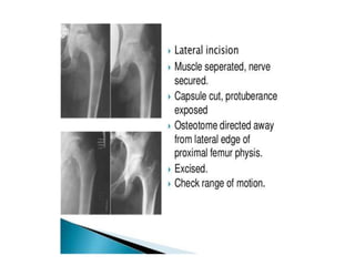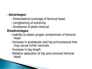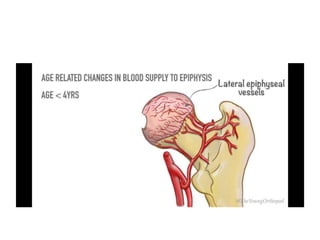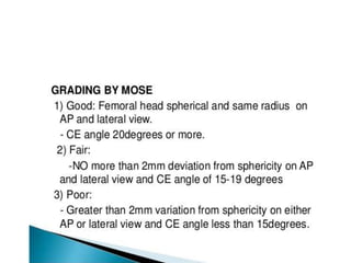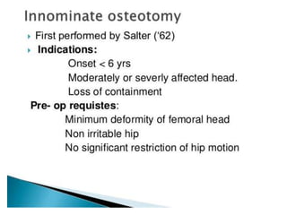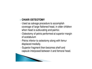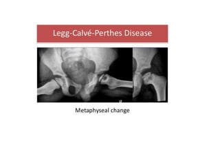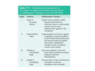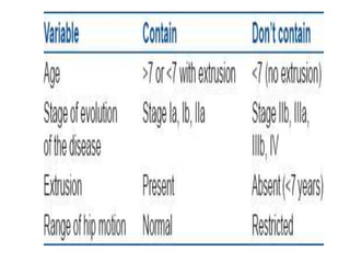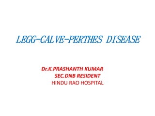 Legg-Calve-Perthes disease is a childhood condition caused by temporary loss of blood supply to the femoral head. It most commonly affects boys ages 4-8 and can cause deformity of the femoral head. Early containment of the femoral head via casts or surgery can prevent deformation and minimize long-term arthritis risk. Prognosis depends on the Herring classification, with surgery beneficial for lateral pillar group B/C cases after age 8. The goal of treatment is to maintain femoral head congruency and minimize secondary osteoarthritis.