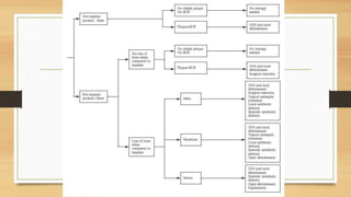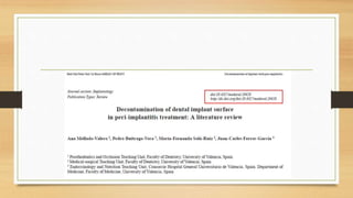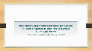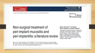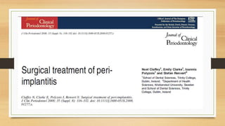 Peri-implantitis is an inflammatory reaction around dental implants that can lead to loss of supporting bone. It has two forms: peri-implant mucositis, which is reversible inflammation confined to soft tissues; and peri-implantitis, which involves progressive bone loss beyond initial remodeling. Risk factors include a history of periodontitis, smoking, residual cement, and implant position/design. Treatment includes non-surgical approaches like mechanical debridement and antibiotics, as well as surgical methods such as regenerative procedures and surface decontamination. The combination of systemic antibiotics, antiseptic mouthwash, and surgical debridement can improve outcomes, though no single surface decontamination method is superior.