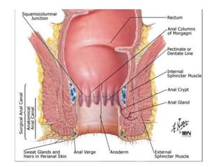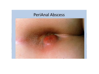 Anorectal abscesses, primarily caused by E. coli infections from anal gland issues, are common in diabetics and immunocompromised individuals. They can be classified into perianal (60%), ischiorectal (30%), and others, with treatments including incision and drainage, antibiotics, and analgesics. Complications may include fistula formation and recurrences, with approximately 50% of patients potentially developing an anal fistula after drainage.