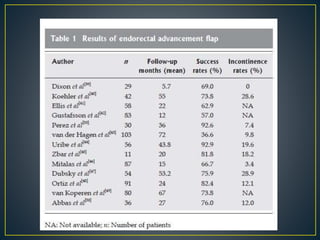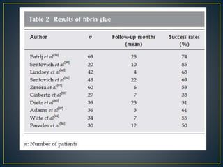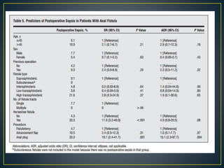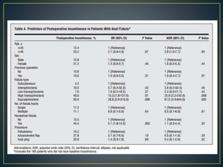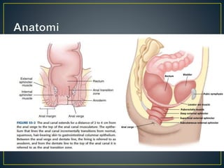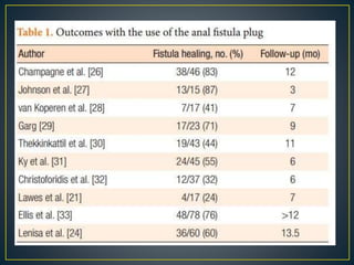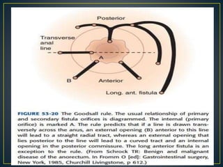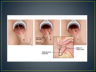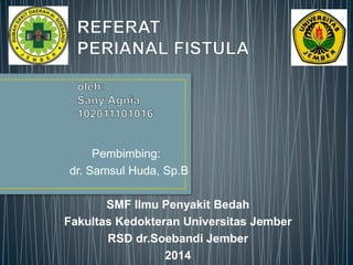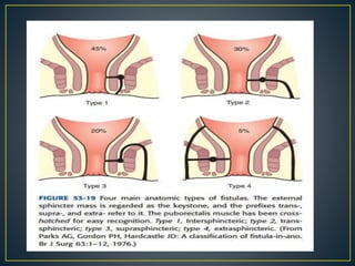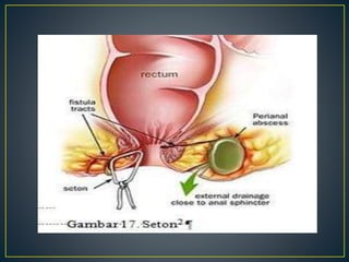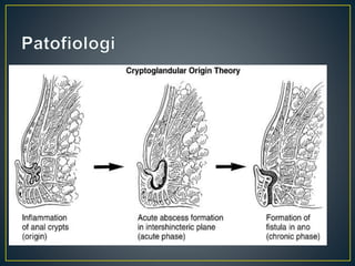 Dokumen ini membahas tentang fistula perianal, termasuk asal usul, klasifikasi, dan metode penanganannya. Dijelaskan bahwa fistula perianal merupakan komunikasi abnormal antara anus dan kulit, dengan berbagai penyebab dan jenis yang berbeda. Tatalaksana mencakup pengobatan medikamentosa dan bedah untuk mengidentifikasi dan mengatasi infeksi serta mencegah kekambuhan.
