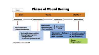 - Periapical wound healing is the host's programmed immunoinflammatory defense mechanism in response to infection or injury. It involves complex overlapping stages including inflammation, proliferation, and remodeling.