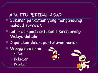 Peribahasa adalah susunan perkataan yang mengandungi maksud tersirat dan lahir dari fikiran orang Melayu. Terdapat berbagai jenis peribahasa seperti simpulan bahasa, perumpamaan, pepatah, bidalan, dan perbilangan, yang menggambarkan sifat dan kelakuan. Contoh-contoh peribahasa menggambarkan pelbagai keadaan dan perlakuan manusia dalam kehidupan seharian.