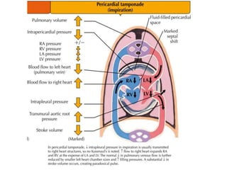 Cardiac tamponade is a life-threatening condition where fluid rapidly accumulates in the pericardial space, preventing the heart from filling properly. It can be caused by many acute or chronic conditions. Physical exam findings include elevated jugular venous pressure, low blood pressure that drops further with inspiration (pulsus paradoxus), and muffled heart sounds. Diagnosis is confirmed with echocardiogram showing cardiac chamber collapse. Treatment depends on the cause but often involves pericardiocentesis or surgical drainage of fluid to relieve pressure on the heart.