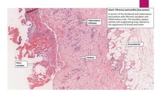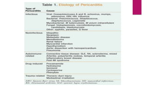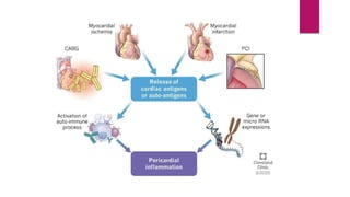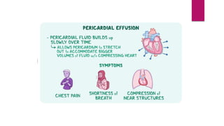 Pericarditis is the inflammation of the pericardium, leading to symptoms such as sharp chest pain, which may improve when sitting up or leaning forward, and is often treated with medications or surgery in severe cases. The condition affects approximately 27.7 per 100,000 individuals annually and can recur in about 30% of patients, with varying forms including acute, recurrent, and chronic constrictive pericarditis. Diagnosis often involves echocardiography and ECG, while complications can include cardiac tamponade, necessitating emergency treatment.