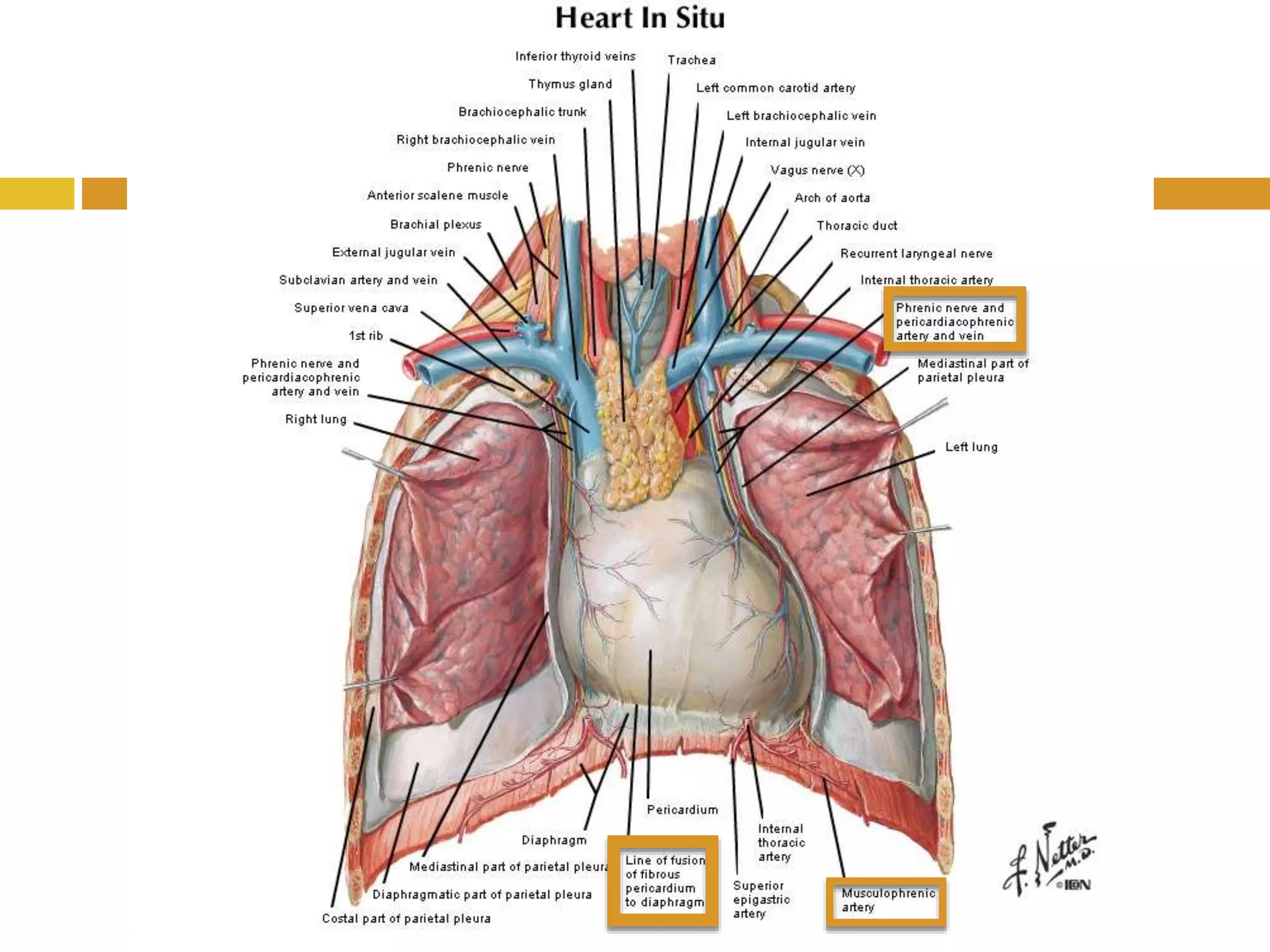 Details on the pericardium's relations to surrounding structures and its attachments.