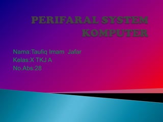 Dokumen ini menjelaskan berbagai perangkat input dan output komputer seperti mouse, joystick, keyboard, scanner, prosessor, dan printer, termasuk fungsi dan jenis-jenis masing-masing perangkat. Mouse digunakan untuk memasukkan data, joystick untuk bermain game, keyboard untuk mengetik, scanner untuk menyalin data, dan prosessor sebagai otak komputer. Selain itu, dibahas juga tentang komponen lainnya seperti motherboard dan perangkat output seperti monitor dan printer.