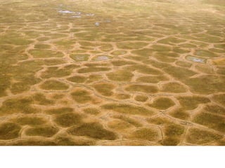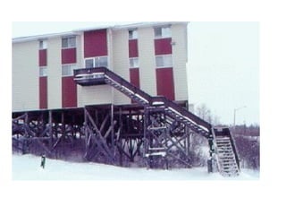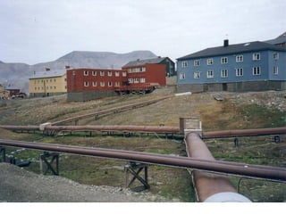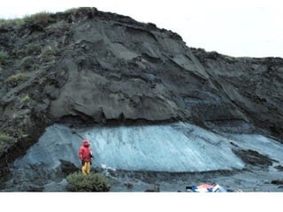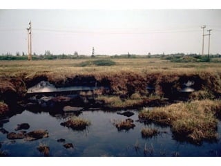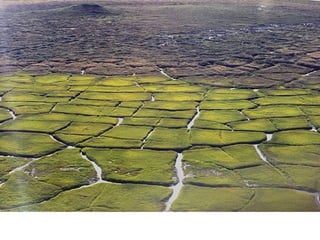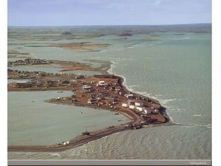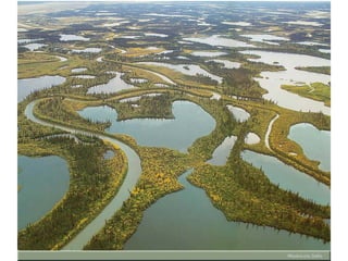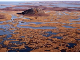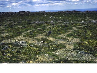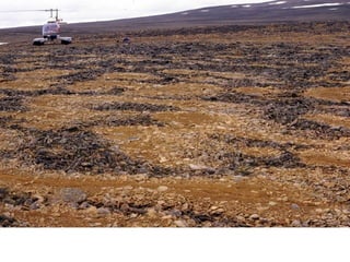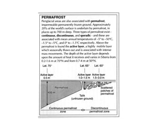 Periglacial environments are defined by the presence of permafrost. Unique landforms such as pingos, palsas, patterned ground including ice-wedge polygons, and thermokarst features form due to freezing and thawing of ice in soils. Permafrost poses challenges for infrastructure development but techniques like using thermosyphons can help ensure stability.