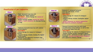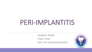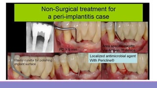 Peri-implantitis is a pathological inflammatory condition affecting the tissues surrounding dental implants, characterized by inflammation of the peri-implant mucosa and progressive bone loss. It is caused by plaque accumulation on the implant surface. Risk factors include a history of periodontitis and smoking. Treatment involves non-surgical mechanical debridement using air abrasives or ultrasonic tips for mild cases. More severe cases may require surgical debridement and decontamination of the implant surface along with local or systemic antibiotics. Long-term maintenance therapy and adherence to the CIST protocol are important for managing peri-implantitis and ensuring the success of dental implants.