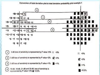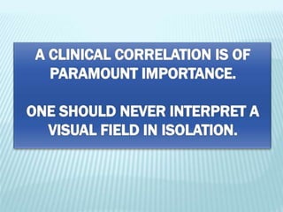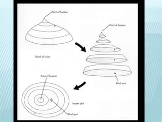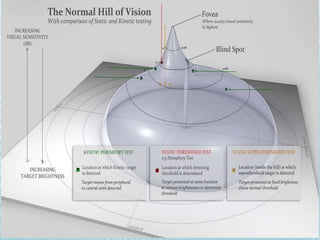 This document provides information about visual field testing. It discusses the anatomy of the visual field and hill of vision. It describes different types of perimetry tests including kinetic and static perimetry. It explains variables used in perimetry like stimulus intensity and size. It provides details about different visual field tests on Humphrey like point patterns, testing strategies, durations and printouts. It discusses analyzing visual field results including reliability indices and total and pattern deviation plots.