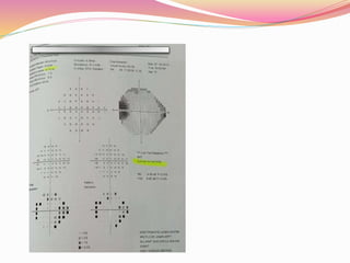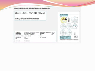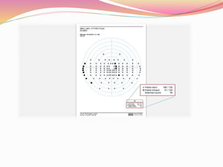 This document provides information about visual field testing and perimetry. It discusses the introduction of visual field and perimetry, the hill of vision, methods of studying visual fields including kinetic and static perimetry, indications for perimetry, terminology used in perimetry, how to perform a perimetry test, and techniques for interpreting perimetry results. Advanced techniques for measuring the visual field such as portable perimetry are also covered.