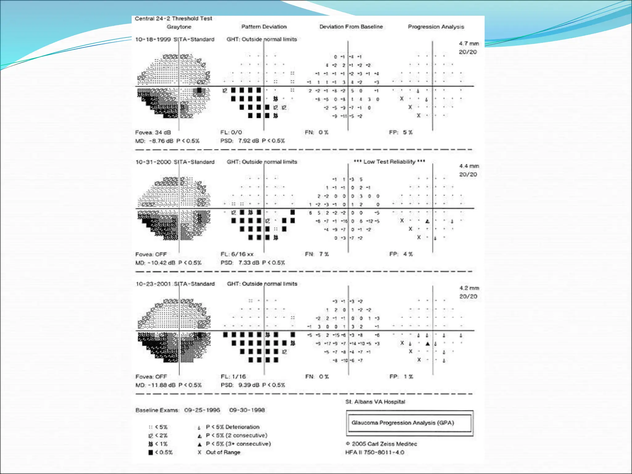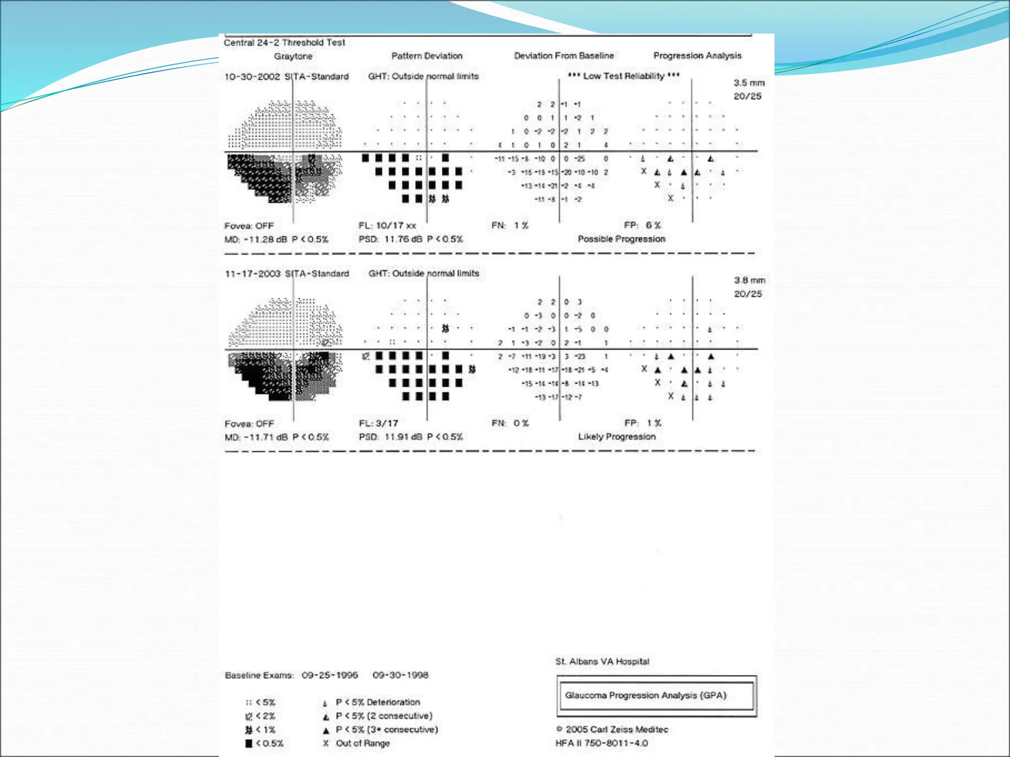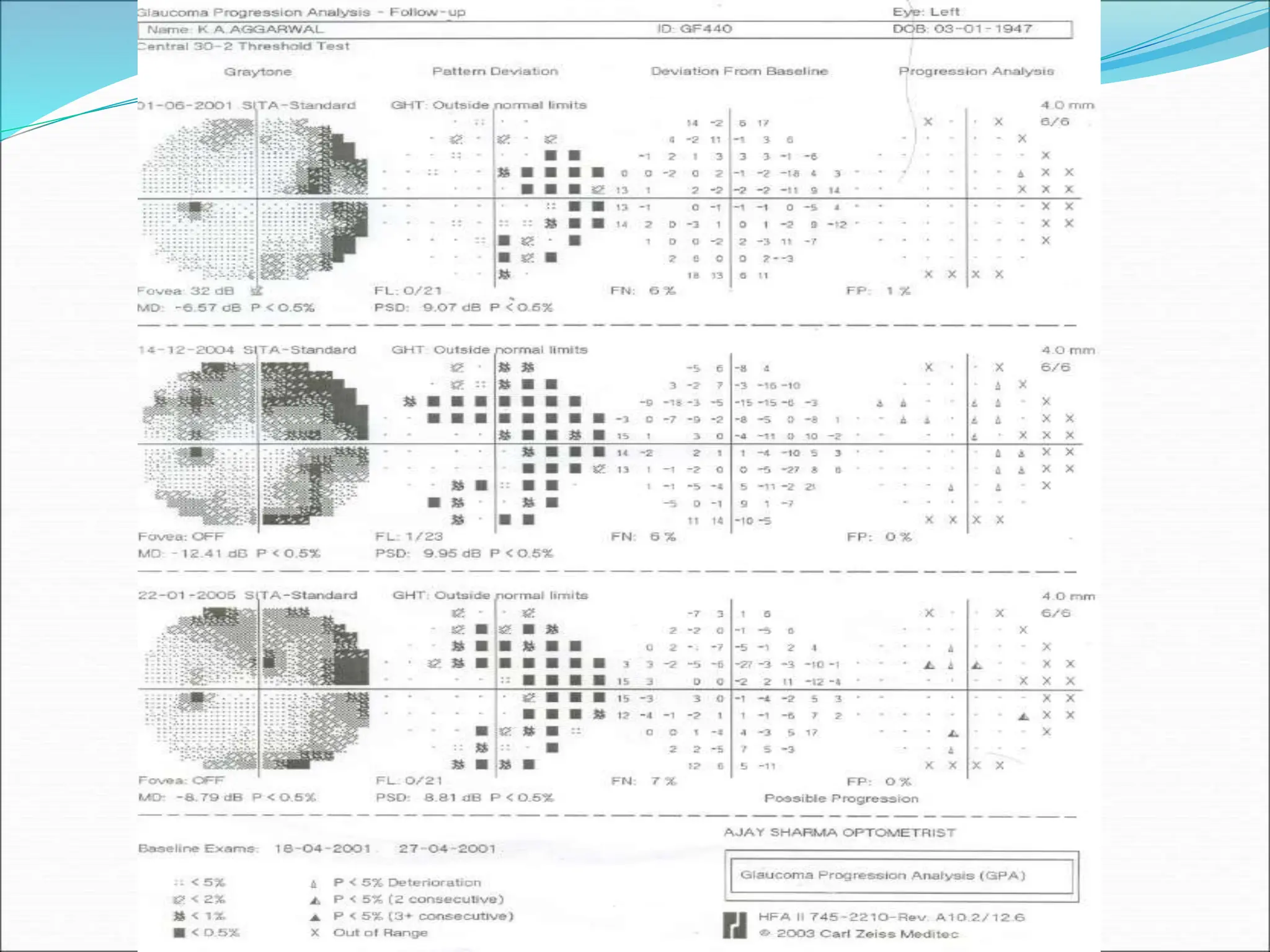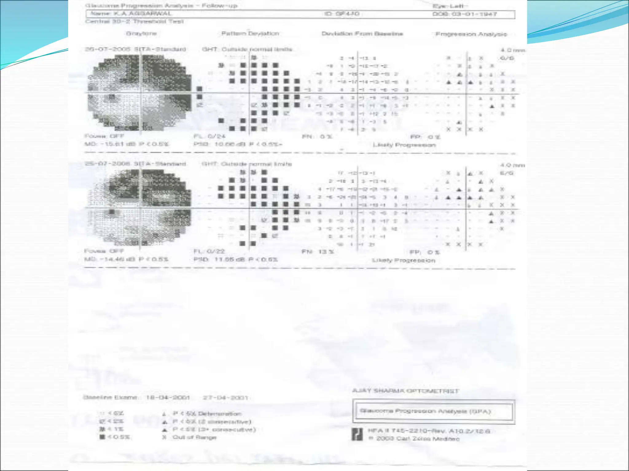 The document discusses ideal features and methods for glaucoma screening, emphasizing tests like octopus perimetry and newer techniques such as short wave automated perimetry and frequency doubling perimetry. It details procedures for detecting and analyzing progression in visual field defects with statistical evaluations and clinical examples for effective monitoring. The importance of establishing baselines and employing advanced software for detecting changes is highlighted to improve patient management and outcomes.