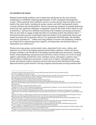 Maternal mental health conditions like depression and anxiety impact 15-20% of pregnant and postpartum women. When untreated, these conditions can have severe adverse effects on the health of the whole family. Despite the high prevalence, only 15-20% of affected mothers receive treatment, and rates are lower for low-income women. Barriers to care include lack of screening, stigma, lack of awareness, difficulty accessing affordable treatment options, and cultural factors. While awareness and support have increased, screening and treatment practices remain inconsistent, especially for low-income and vulnerable populations.