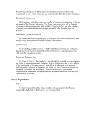 The document outlines the corporate governance guidelines of Perini Corporation. It discusses (1) the composition and responsibilities of the Board of Directors, including director qualifications and independence, (2) the roles and responsibilities of Board committees, and (3) policies regarding Board performance evaluation, director orientation, management succession planning, and the company's code of business conduct. The guidelines are intended to assist the Board in exercising its duties to stakeholders.