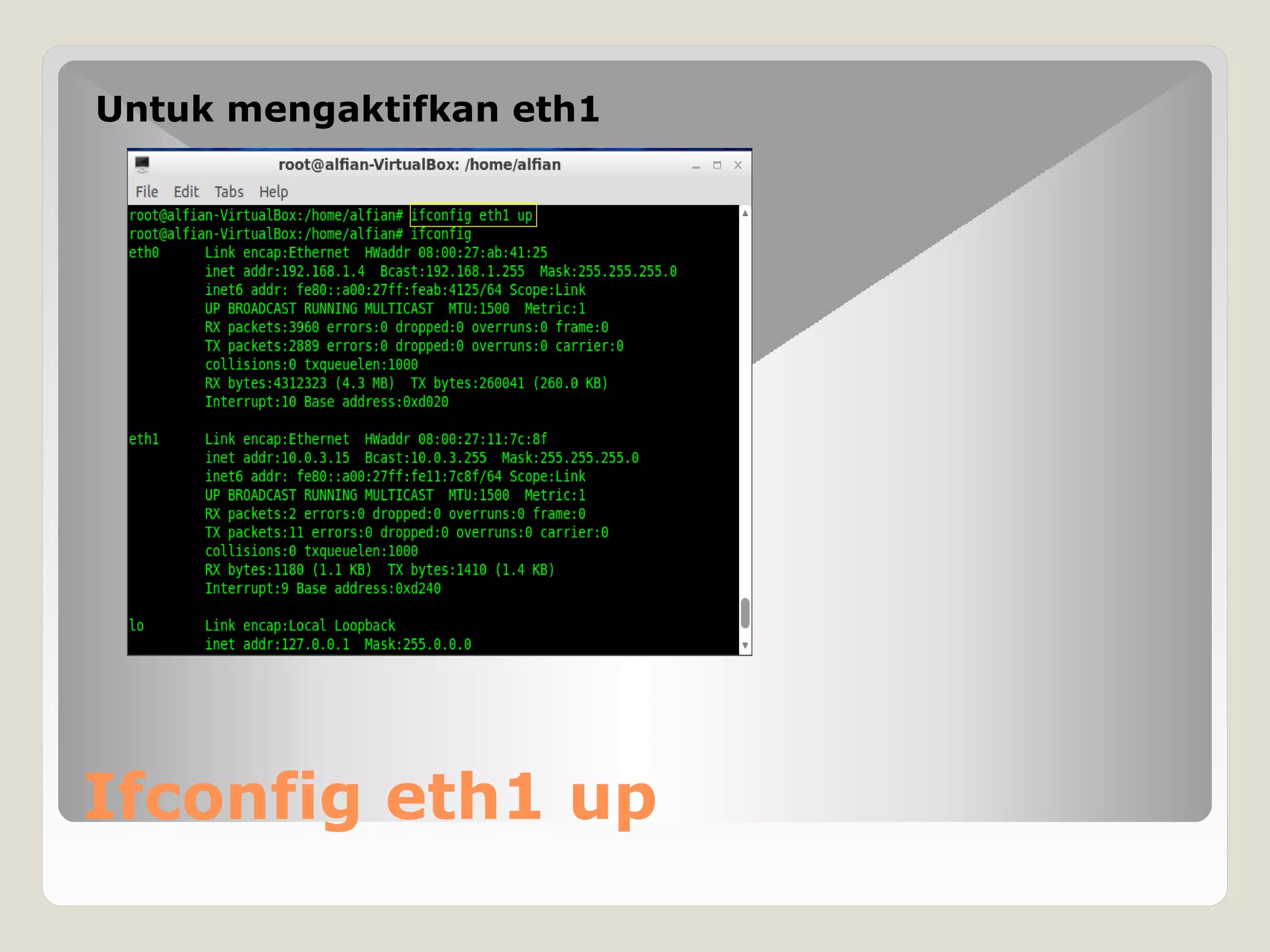 Dokumen ini memberikan penjelasan singkat tentang perintah dasar Linux untuk mengaktifkan dan menonaktifkan jaringan, mengubah password, melihat informasi sistem seperti waktu, penggunaan disk, proses yang berjalan, serta mengeluarkan perangkat penyimpanan eksternal. Beberapa perintah yang dijelaskan adalah ifconfig, date, time, df, ifconfig, top, ps, eject dan mount.