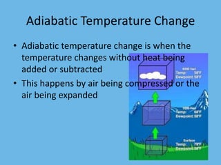 This document discusses various cloud formation and precipitation processes including: adiabatic temperature change caused by air compression/expansion; orographic lifting where winds force air up mountains cooling it; frontal wedging where warm/cold air collide forming storms; convergence where air flows together upward; localized convective lifting forming warm air pockets called thermals; stability based on air density differences; condensation requiring saturated air; the types and heights of clouds; vertical cloud development enhancing movement; fog forming over land or sea; cold/warm cloud precipitation mechanisms; and rain, snow, sleet, glaze and hail depending on atmospheric temperatures.