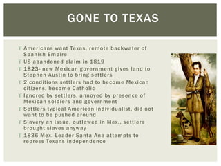 The document summarizes Chapter 17 which discusses the events leading up to the Mexican-American War and Texas achieving independence from Mexico in 1836. Key points include that American settlers in Texas did not want to follow Mexican rules requiring they become Catholic and citizens, tensions rose between settlers and the Mexican government, and the independence of Texas from Mexico in 1836 after the battles of the Alamo and Goliad rallied American support behind the Texan cause.
