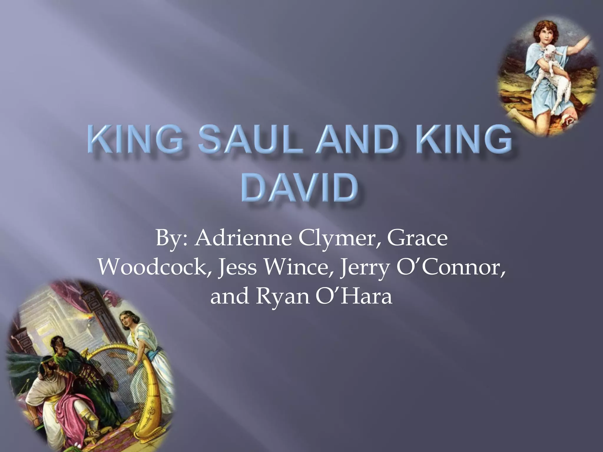 1) Samuel anoints David as the future king of Israel even though Saul is still king. David proves himself against Goliath and plays music to ease Saul's mood, but Saul grows jealous of David's popularity.