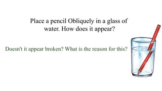1) A pencil placed obliquely in a glass of water appears broken due to the bending of light at the interface between air and water.