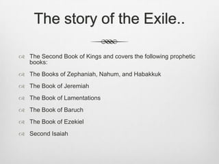 1) The document summarizes the Book of Kings and the prophetic books of Zephaniah, Nahum, Habakkuk, Jeremiah, Lamentations, Baruch, and Ezekiel that cover the period of the Jewish exile from Israel.