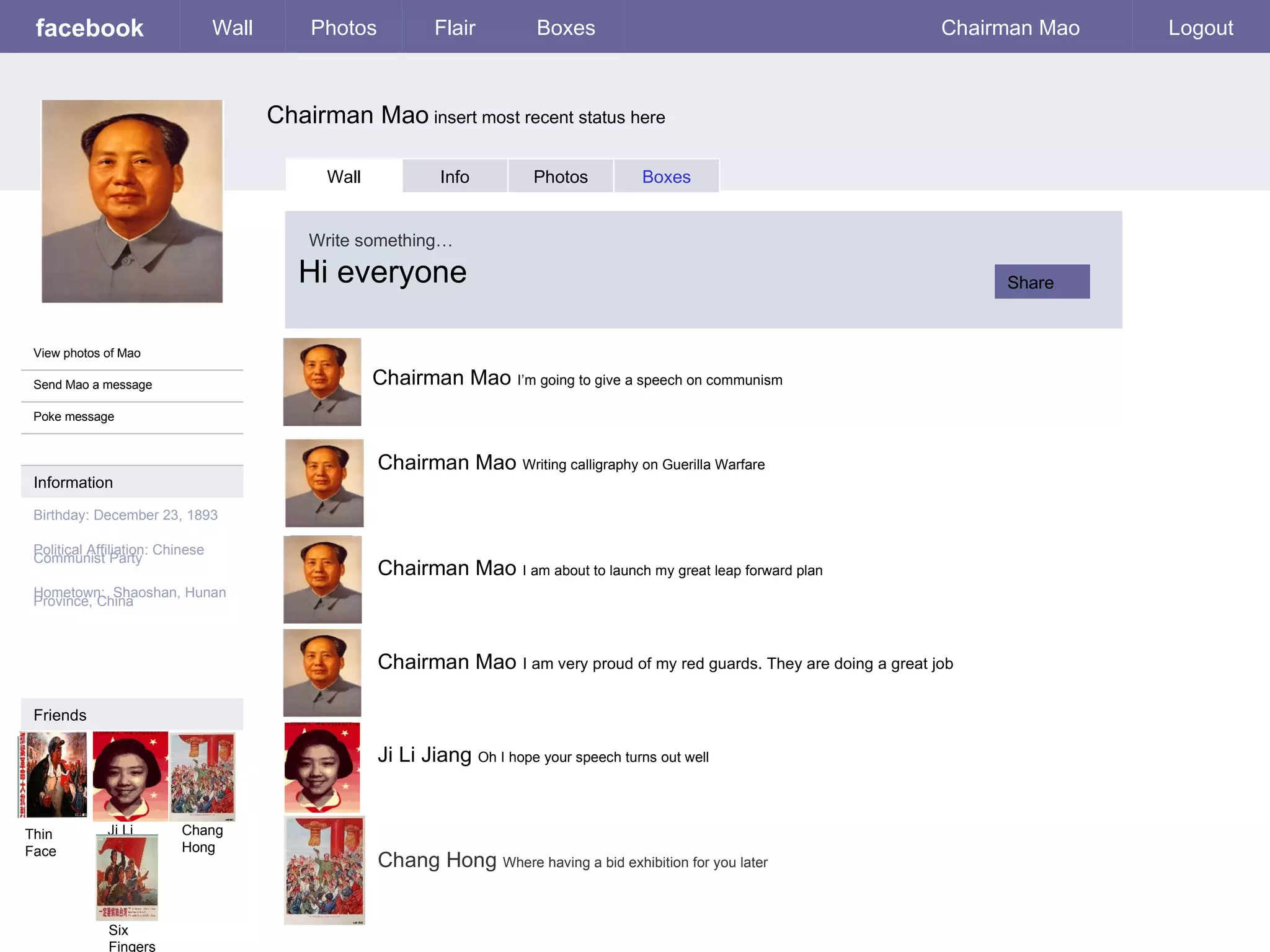 This document appears to be a mock Facebook profile for Chairman Mao of China. It includes biographical information like his birthday and hometown. It shows his friends and posts from them praising his upcoming speech and exhibition. The profile also shares personal details about Mao's profession, interests, enemies and favorite quotes. Contact information like his address and phone number are provided. Photos of Mao are available to view on his profile page.