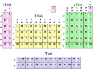 - Elements are organized by period and group based on their valence electrons and orbital occupation