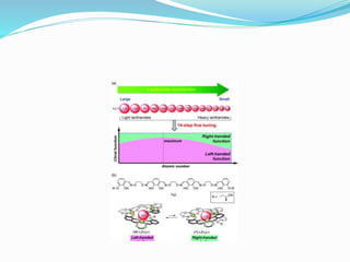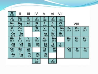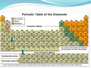 The document discusses the history and development of the periodic table. It explains that early scientists like Dobereiner and Newlands began classifying elements based on their properties, but that Dmitri Mendeleev created the first recognizable periodic table in 1871. His table arranged elements in order of atomic mass and predicted properties of undiscovered elements. Later, Moseley's discovery of atomic number allowed the modern periodic table to arrange elements by atomic number instead of mass. The document also discusses trends in properties within the periodic table.