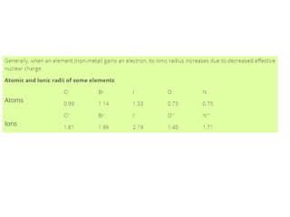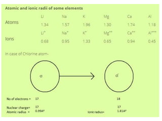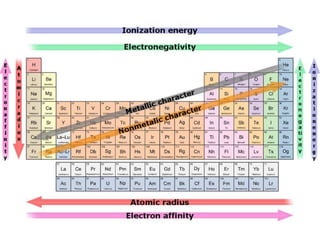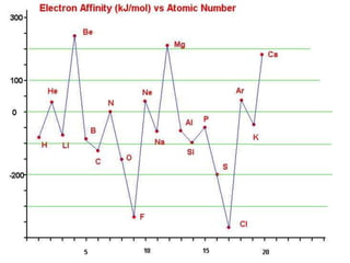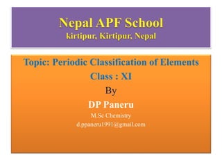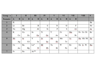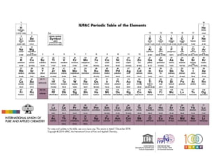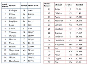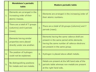 The document discusses the periodic classification of elements. It provides the atomic numbers, symbols, and atomic masses of the first 30 elements in the periodic table. It then discusses the key features and components of modern periodic tables, including that elements are arranged by atomic number rather than atomic mass. The modern periodic table contains 7 periods and 18 groups, with elements in the same group having the same number of electrons in their outer shell. It also notes the advantages of the modern periodic table over previous classifications.