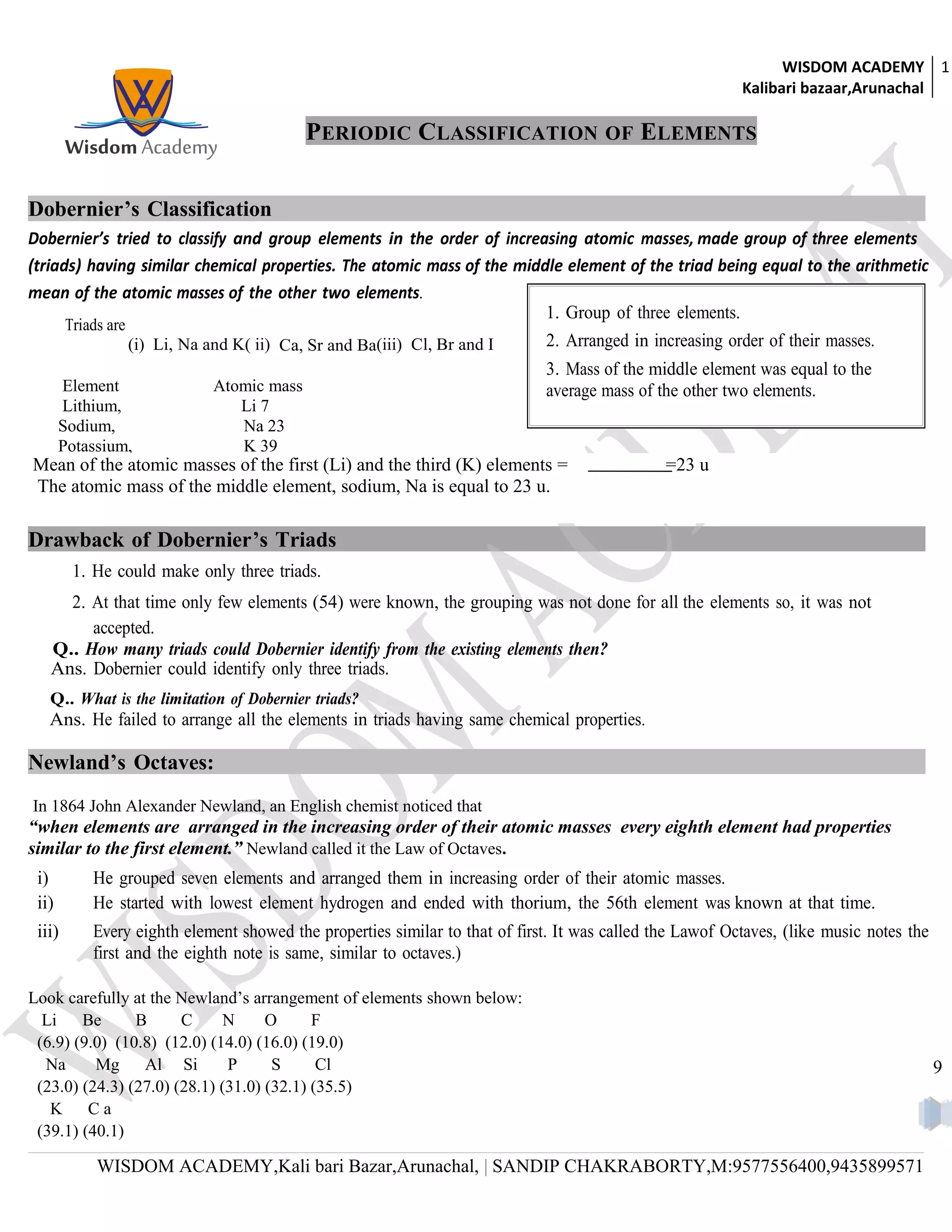 1. Dobernier's periodic table classified elements into triads based on atomic mass, but could only form three triads.