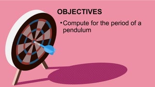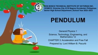 The document is a lesson on pendulum mechanics for a Physics course, focusing on the concepts of acceleration and free fall. It defines a pendulum's components, including its period, amplitude, and the formula used to calculate the period based on the length of the string and gravitational acceleration. Additionally, it provides sample problems to illustrate how to compute the period for pendulums of different lengths.