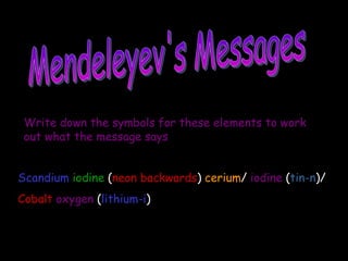 Mendeleyev's Messages Writedown the symbols for these elements to work out what the message says Scandium iodine ( neon backwards ) cerium / iodine ( tin-n )/ Cobalt oxygen ( lithium-i )