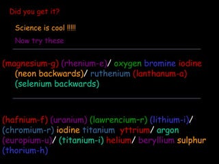 Did you getit? Science is cool !!!!! Now try these (magnesium-g) (rhenium-e) / oxygen bromine iodine (neon backwards) / ruthenium (lanthanum-a) (selenium backwards) (hafnium-f) (uranium) (lawrencium–r) (lithium-i) / (chromium-r) iodine titanium yttrium / argon (europium-u) / (titanium-i) helium / beryllium sulphur (thorium-h)