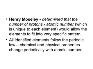 The periodic table organizes elements according to increasing atomic number and displays their chemical and physical properties. Dmitri Mendeleev arranged elements in a table that predicted undiscovered elements. Henry Moseley determined that atomic number, not atomic mass, was key to the table's structure. Elements are classified as metals, nonmetals, and metalloids based on their locations and properties. The table shows how elements' properties periodically repeat according to their atomic structure.