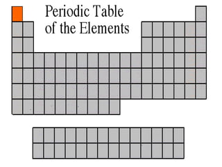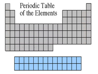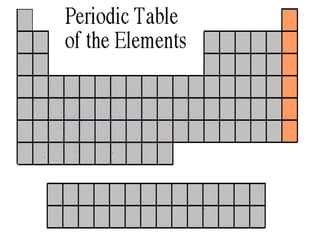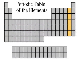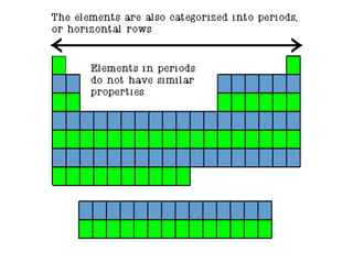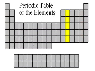 The document provides information about the periodic table of elements, including that it organizes elements according to their atomic number and properties. Key aspects of the periodic table include the atomic number, atomic mass, symbols, and position of elements which can provide insight into their properties. The document also summarizes common elements, families of elements, and properties of metals, non-metals, and metalloids.