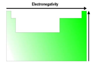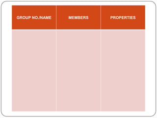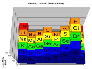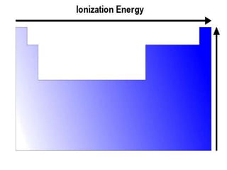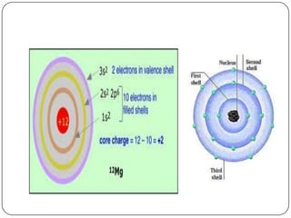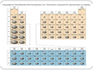 The document summarizes the development of the periodic table of elements from early classifications by scientists like Dobereiner, Newlands, and Mendeleev to the modern periodic table based on atomic number. It describes key periodic properties including atomic size, ionization energy, and electronegativity that led to the establishment of recurring trends in physical and chemical properties of elements when arranged in the periodic table.